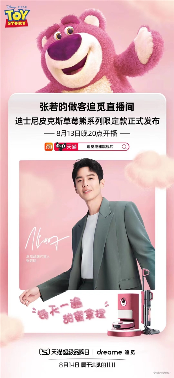 8月14-15日,智能清洁领域的创新科技品牌追觅科技,携迪士尼联名款草莓熊系列限定款产品,正式开启首个天猫超级品牌日。以“每天一遍,甜蜜拿捏”为主题,追觅天猫超级品牌日特别策划线下快闪活动,同步以追觅品牌代言人张若昀领衔联动多平台达人,共同打造追觅全网超级直播间,成功助力追觅闪耀出圈,交出全周期破7000万成交额的满意答卷,主推产品追觅机皇扫地机M13、旗舰扫地机器人S10,双双荣登天猫类目TOP1。