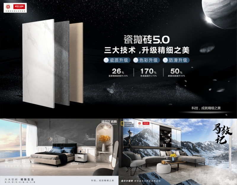诺贝尔产品在领先科技的加持下,不断推出优质的产品,瓷抛砖5.0的三大技术升级,让瓷砖瓷质更精细、色彩更逼真、表面更防滑;诺贝尔推出的岩板,更是明星爆款产品,作为岩板定制的新物种,具有食品级健康表面,不惧高温经得起任何烤验;2021年即将推出的新品,更是在设计源头上进行了升华,从大自然中获得了研发的新灵感。