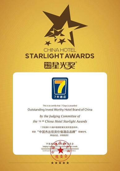 星光奖被誉为“中国酒店业奥斯卡”,历经十六年发展,见证了中国酒店行业的历史沿革与发展轨迹,也积淀了丰富的行业优质理念。经过严谨的评选过程,对行业作出贡献、推动中国酒店业界竞争发展的酒店企业做出表彰,并对具备真知灼见、领导才能及卓越成就的业界领袖进行嘉奖。7天酒店的获奖是行业高度认可的信号,也是未来前景广阔的预兆。