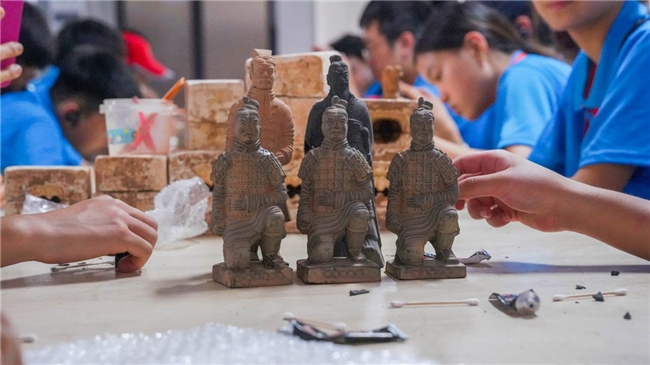 文物修复是一个缜密细致的工作,而“成为文物修复师”,让原本破损的兵马俑重新焕发生机、再现光彩也成为营员们此行中的重要一环。在文物修复课堂上,大家聆听老师讲授修复知识,在专业指导下,通过清理俑片、拼对补全、细心粘接等工序成功修复陶俑。文物修复师就像是医生,他们拿捏着文物的命脉,承载灿烂文明的延续,“成为文物修复师,修复秦兵马俑”不仅是一次技能的学习,更是一次文化的传承与致敬。