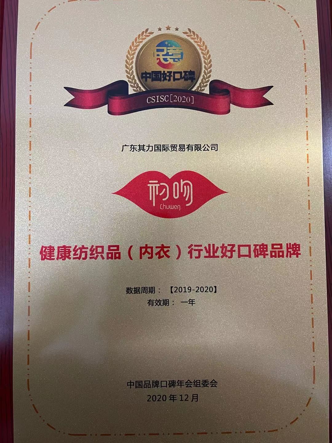 2020年12月26日,由工信部工业文化发展中心、首页大数据等机构联合发起的第七届中国品牌口碑年会在京召开,发布了2019-2020年度中国品牌口碑指数报告,年会聚焦“新基建下的数字经济品牌发展”,推出快速消费品、耐用消费品、生活服务及数字经济品牌四大类39个品类的年度中国好口碑品牌榜单,海尔智家、三元、澳柯玛、加多宝、睿至等知名品牌在列。广东其力国际贸易有限公司旗下的“初吻”品牌获得中国健康纺织品行业活氧内衣品牌“好口碑”荣誉大奖。